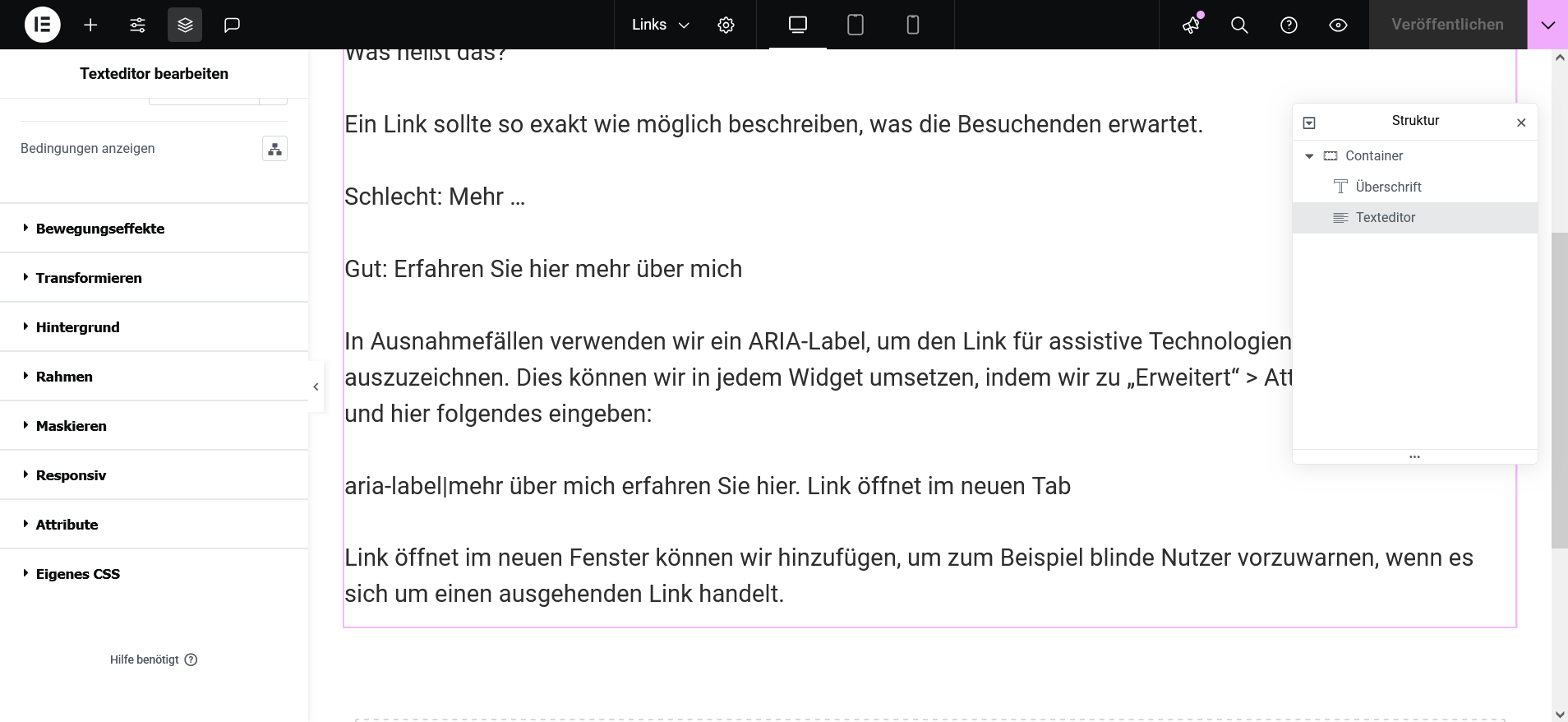 In Ausnahmefällen verwenden wir ein ARIA-Label, um den Link für assistive Technologien wie Screenreader auszuzeichnen. Dies können wir in jedem Widget umsetzen, indem wir zu „Erweitert“ > Attribute navigieren und hier folgendes eingeben: